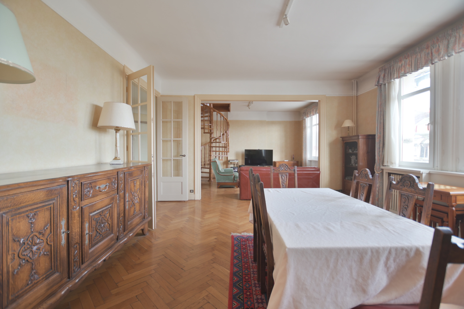 Dans un immeuble de caractère, emplacement de tout premier ordre au Croisé Laroche ; à proximité immédiate du Tram, nous vous proposons ce très bel appartement au cachet préservé que quelques travaux de rafraîchissement sublimeront. D'une surface de 194 M2, situé au dernier étage avec ascenseur, il propose un vaste double salon/séjour (48 m2), 4 chambres dont 2 avec leur propre salle de bain, 1 salle de bain, une vaste cuisine / salle à manger. L'ensemble est desservi par un large couloir. La vue surplombe la ville, tant à l'avant qu'à l'arrière. Travaux de toiture et de ravalement de façade en cours de réalisation (à charge vendeurs). Possibilité d'acquérir deux garages (15.000 € / l'unité). Charges de copropriété mensuelles : 550 € (comprenant régisseur, eau, ascenseur, entretien,...)